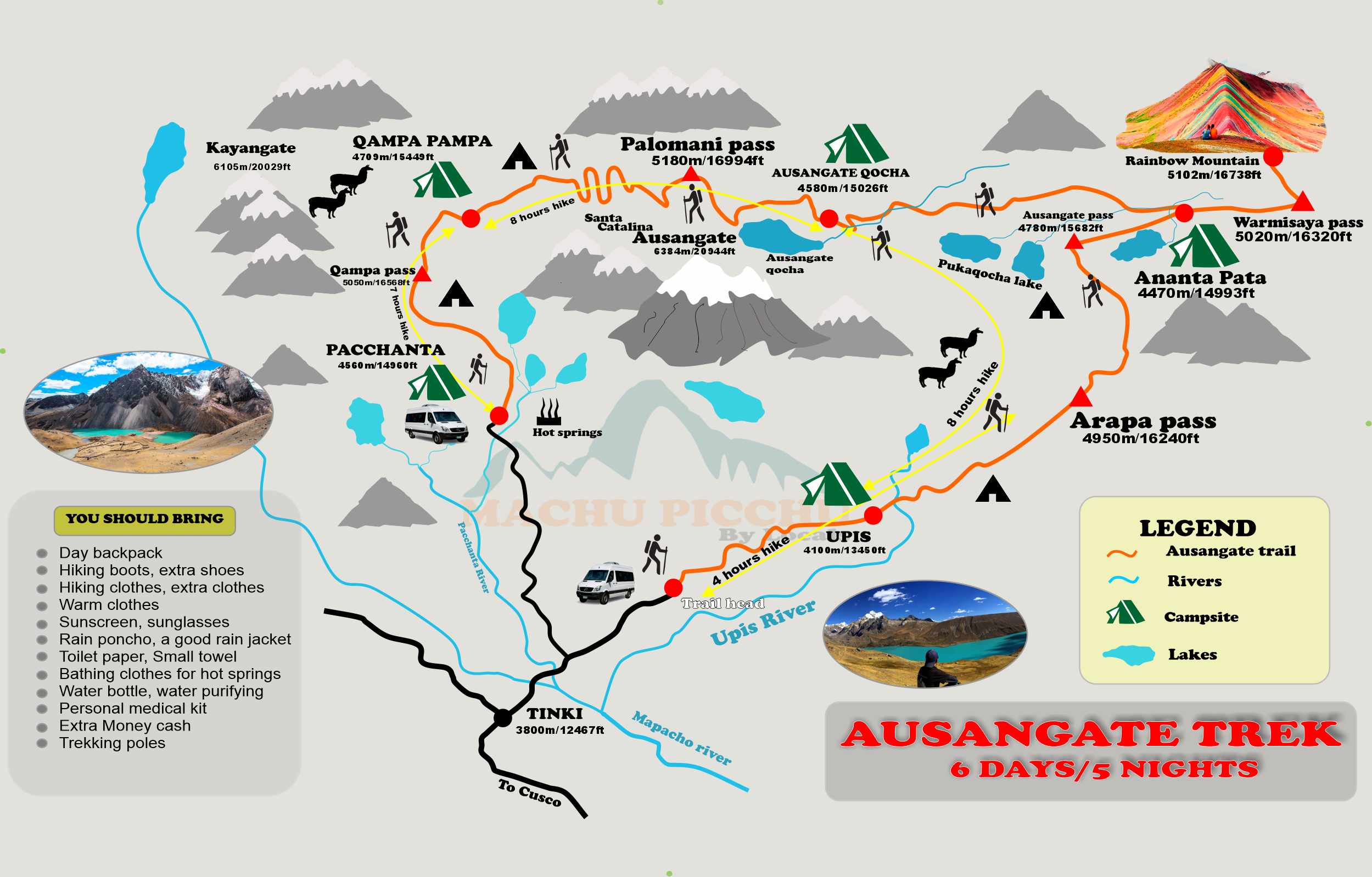 Extended Ausangate Trek 6 Days is the most fascinating hike on the Peruvian Andes, located in the Vilcanota range on the southern part of Cusco city. This area has impressive mountains and includes the highest mountain peak, Ausangate, with 6385 m (20948 ft), considered one of the most important deities called “Apus.” It is an excellent trekking area, offering travelers more than they could ask for: spectacular and colorful mountains, glacier scenery, snow-capped peaks, hot springs, turquoise lakes, glaciers, flora (most of the plants are medicinally used by the locals), and fauna like condors, llamas, alpacas, vicuas, and chinchillas. Picturesque villages and traditionally dressed local people.